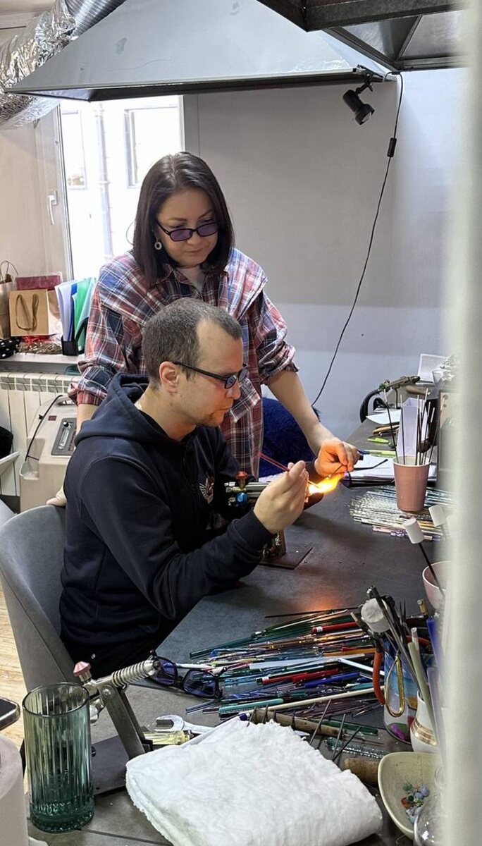 На прошедших выходных состоялся наш первый квартирник. Наши гости плавили стеклянные бусины, угощались игристым и вкусными закусками, а мы радовались, что всё получилось именно так, как мы придумали. Надежда Федосеева, владелица бренда Baikal Murano: «Наши гости приходили на квартирник целыми семьями, кто-то приводил подружек. В нашей студии царила приятная предновогодняя атмосфера. Все сошлись в одном – плавить стекло не так уж и просто, это очень непростой, трудоёмкий процесс». Выплавить свои бусины попробовали и члены нашей команды, которые впервые сели за горелку. Яна Мордухович, SMM-специалист бренда Baikal Murano: «Это был забавный опыт для меня, потому что я левша. Сначала даже было ощущение, будто у меня проблемы с мелкой моторикой, хотя у меня с рукоделием всегда всё хорошо. Я много чего перепробовала в этой жизни, но со стеклом встретилась впервые, и получилось. Вообще из-за нехватки опыта кажется, что это очень сложно, потому что не понимаешь, как далеко нужно держать инстру