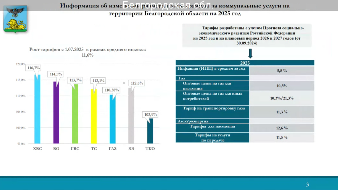 В рамках пресс-конференции начальник управления по государственному регулированию цен и тарифов в Белгородской области Наталья Косилова рассказала об изменениях в ценах на коммунальные услуги в наступающем году. Так, средний индекс роста с 1 июля 2025 года составит 11,6%. С учётом 4,8% допустимого отклонения, установленного Правительством РФ, предельный индекс будет равен 16,4%. Подробнее о каждом направлении — на слайде. Повышение тарифов необходимо для регулярного проведения ремонтных и восстановительных работ, стабильного поддержания сетей.