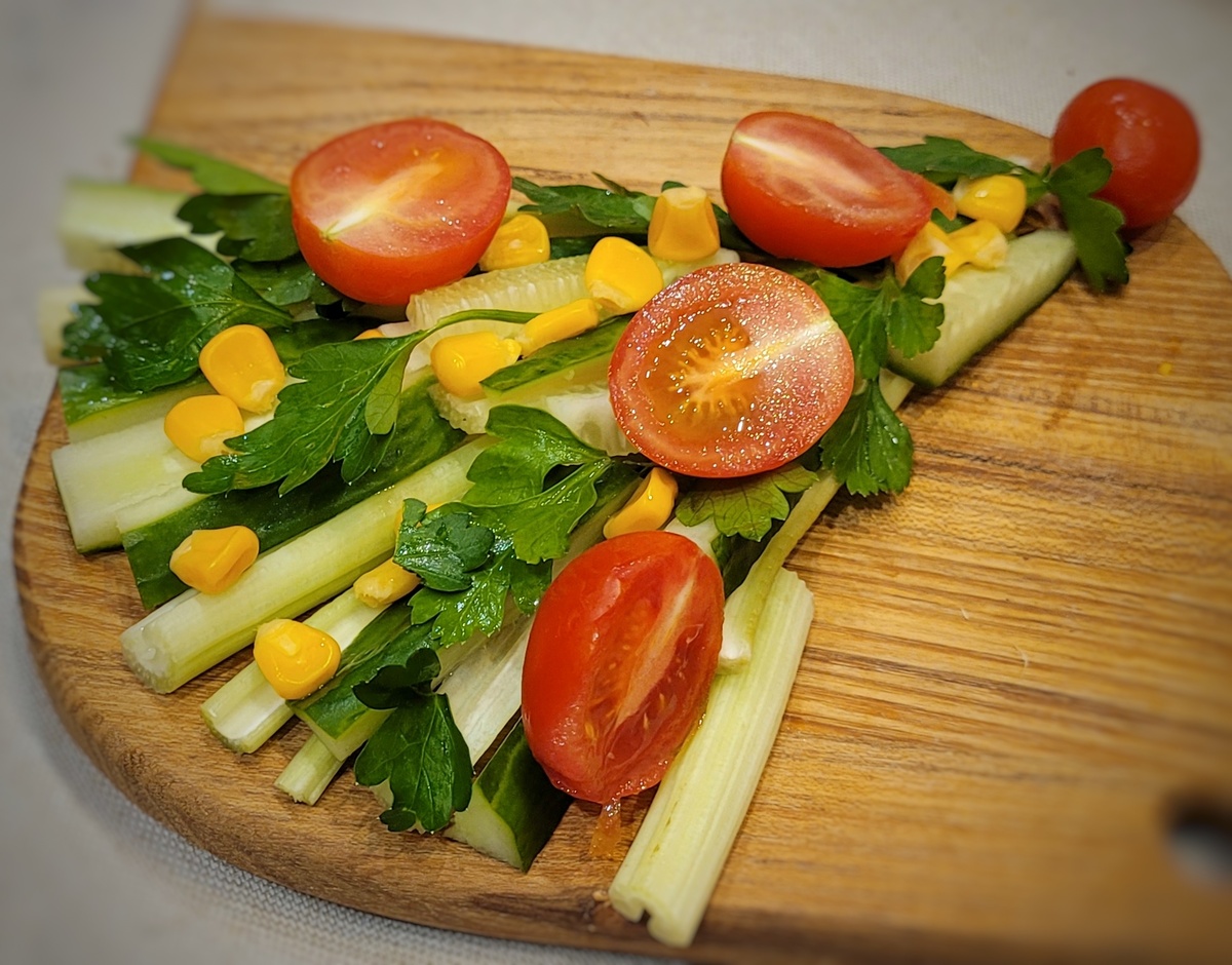 На новый год предлагаю не обьедаться и обязательно включить в меню сырую клетчатку. Ведь благодаря ей питается наша полезная микрофлора, а кишечник работает, как часы! Понадобится: ✔️сельдерей 1 стебель ✔️огурец половина от крупного ✔️черри 3-4 шт ✔️петрушка ✔️кукуруза Также можно использовать: ✔️броколли ✔️болгарский перец ✔️морковь и пр Приготовление: Огурец и сельдерей разрезать на примерно равные дольки, черри разрезать попалам Из огурца и сельдерея внахлест составляем ёлочку той формы, которая вам нравится Затем начинаем украшать : Вместо ёлочных игрушек-половинки черри. Вместо гирлянды- зерна кукурузы Также можно из моркови или болгарского перца вырезать кружки или специальными вырезалками для овощей вырезать фигурки звездочек/цветочков и пр Распушить ёлочку поможет зелень Готовится просто и быстро, очень здорово готовить такую с детками) Денис наелся огурцов и кукурузы, пока помогал собирать блюдо)) Приятного аппетита❤️