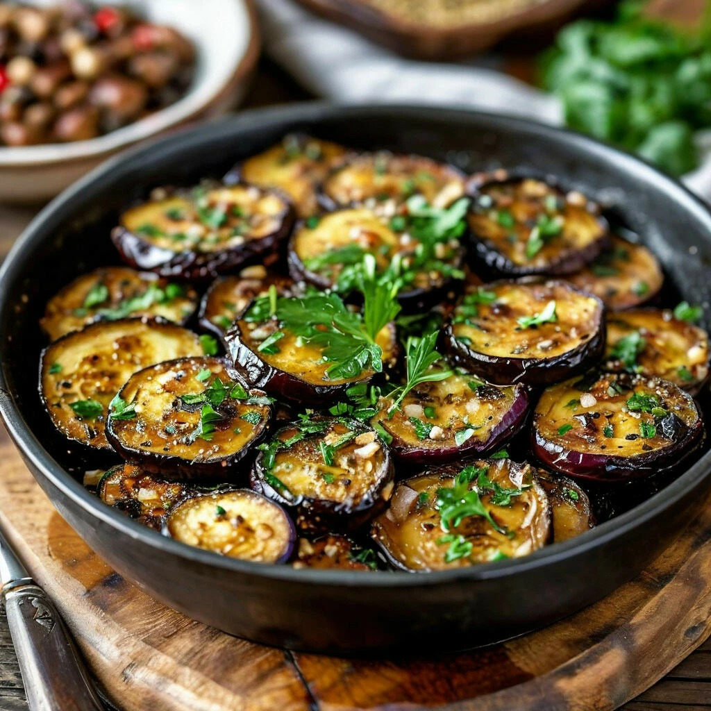 Выложите баклажаны в сковороду и жарьте до золотистой корочки с обеих сторон (примерно по 3-4 минуты с каждой стороны). - Добавление чеснока: Когда баклажаны будут готовы, добавьте мелко нарезанный чеснок и жарьте еще 1-2 минуты, пока чеснок не станет ароматным.
