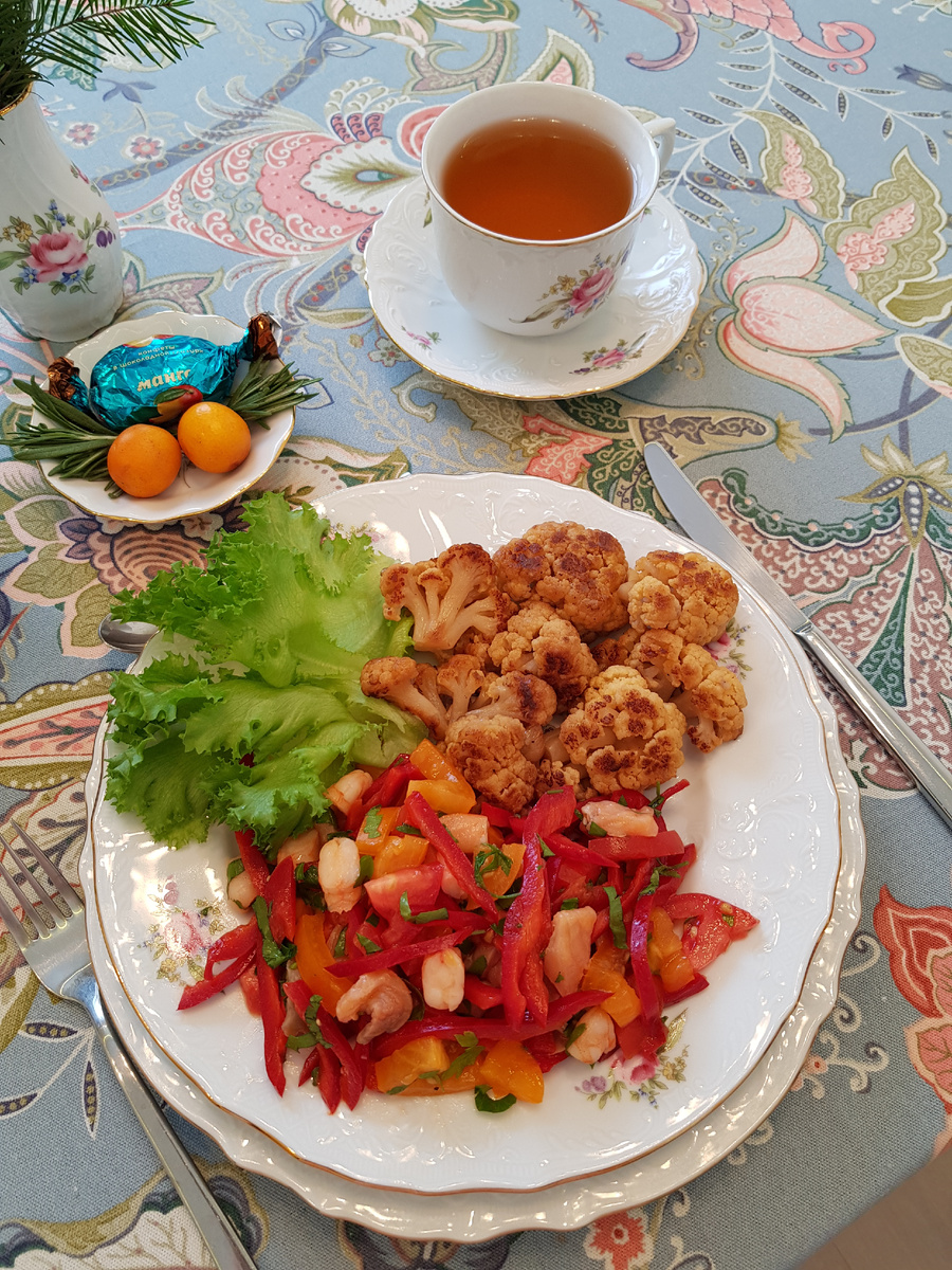 Добрый день, дорогие друзья! Многие готовятся к приближающемуся празднику, для других праздничные дни оказались рабочими или поменялись планы в последний момент, а времени и сил на приготовление застолья совсем не осталось. Сегодня я представляю вашему вниманию ужин, который потребует минимум усилий и времени, но при этом подарит ощущение праздника. Для приготовления цветной капусты нам понадобятся: 300 грамм размороженной цветной капусты желтого цвета (можно любого: белого, фиолетового, розового, зеленого), 1 столовая ложка масла из виноградных косточек, 1/8 чайной ложки соли, 1 зубчик чеснока, 1/10 чайной ложки черного молотого перца, 1/10 чайной ложки молотого мускатного ореха. Для приготовления салата нам понадобятся: сладкий перец 1 штука, сливовидный желтый помидор 1 штука, сливовидный красный помидор 1 штука, зелень петрушки, 1/4 лимона, 100 грамм креветок в заливке, 100 грамм соленой семги, 1 столовая ложка масла из виноградных косточек. Приготовление: цветную капусту размороз