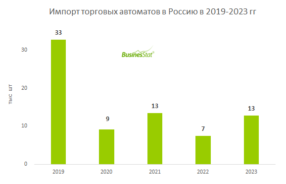 В 2023 г импорт торговых автоматов в Россию вырос на 74% и достиг 13 тыс шт.