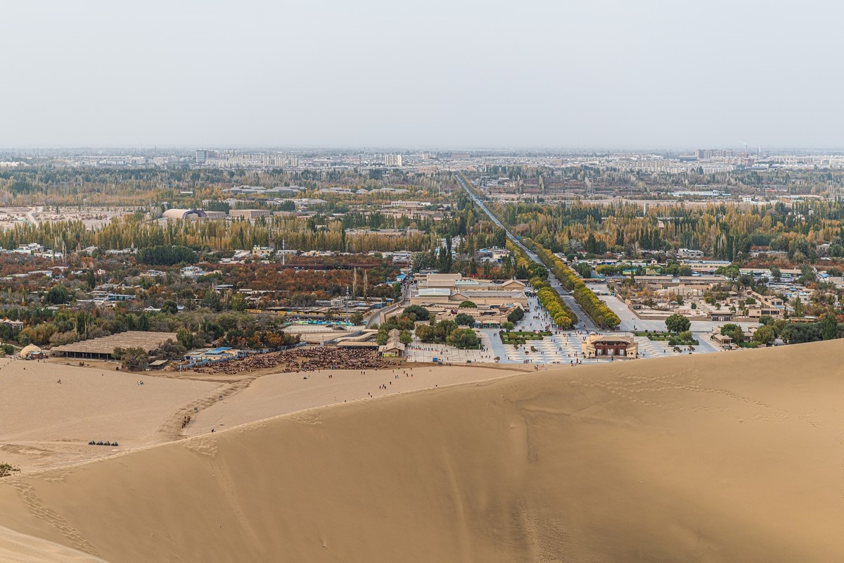 Дуньхуан. Это название мало что говорит широкой читательской аудитории – и зря! Сейчас мы это исправим :) Тем более, что эта точка – следующая по траектории маршрута нашего осеннего путешествия по Китаю. Итак, Дуньхуан (Dunhuang). Город, расположенный на месте оазиса, окружённого каменистыми ландшафтами пустыни Такла-Макан (вот здесь на карте). Город достаточно древний, он был одним из «хабов» Великого шёлкового пути. Интернеты также утверждают, что это место было населено ещё за пару тысяч лет до того. Но не будем углубляться в историю – мы же не учёные-путешественники, а созерцательные туристы, мы здесь, чтобы наслаждаться (и вас наслаждать тоже :) видами. А здесь есть на что посмотреть, поскольку вокруг города раскинулась одна из крупнейших в мире пустынь Такла-Макан с вполне размерными дюнами: Соприкосновение пустыни с цивилизацией рождает очень необычные картинки: Называется это место Mingsha Mountain Crescent and Lake Nature Park. На входе — ворота «в чистом поле»: Наверное, надо