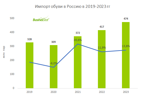 В 2020-2023 гг импорт обуви в Россию увеличился более чем в 1,5 раза: с 309 до 474 млн пар.