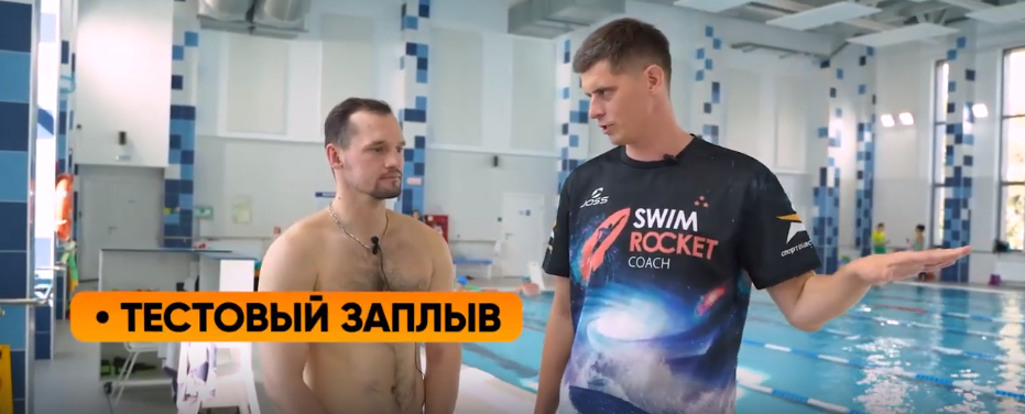 Сегодня расскажем о том, как за один час учился плавать известный сноубордист Алексей Соболев. Сначала Алексея ждет тестовый заплыв, затем определяется план. Затем сама тренировка. А в конце — экзамен. Но начинать всегда надо с разминки. Когда мы разминаемся перед бассейном, наши мышцы подготавливаются к тренировке, они быстрее включаются в работу, проще поворачивать голову, скручивать корпус и т.д. В ходе тестового заплыва выяснилась ошибка — Алексей плывет с поднятой головой. Из-за этого возникает большое сопротивление. Также нужно поработать над дыханием. Кроме того, Алексей сделал 29 гребков на 25 метров, т.е. один гребок меньше метра, что говорит о маленькой эффективности. План на тренировку: научиться опускать голову под воду и дышать, сократить количество гребков и повысить их эффективность. Начинается тренировка с упражнения с доской на работу ног. Для выполнения упражнения нужно взять доску в руки, вытянуть их, голова под водой, для вдоха голову нужно поднять. Однако у Алексея