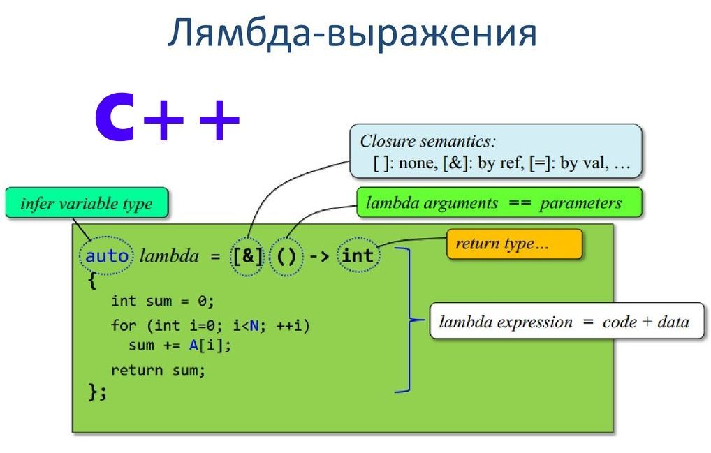Лямбда-выражения в C++ — это удобный способ определения анонимных функций прямо в коде. Они позволяют создавать функции без необходимости их предварительного объявления. Лямбда-выражения особенно полезны при работе с алгоритмами STL, такими как std::sort, std::for_each, std::remove_if и другими. Общий синтаксис лямбда-выражения выглядит следующим образом: [capture](parameters) -> return_type { // тело функции } #include <iostream> int main() { auto greet = []() { std::cout << "Hello, World!" << std::endl; }; greet(); // Вызов лямбда-выражения return 0; } Лямбда с параметрами: #include <iostream> int main() { auto add = [](int a, int b) { return a + b; }; std::cout << "Sum: " << add(5, 3) << std::endl; // Вывод: Sum: 8 return 0; } Лямбда с захватом переменных: #include <iostream> int main() { int x = 10; int y = 20; auto add = [x, y]() { // Захват x и y по значению return x + y; }; std::cout << "Sum: " << add() << std::endl; // Вывод: Sum: 30 return 0; } Лямбда с захватом по ссылке: #in