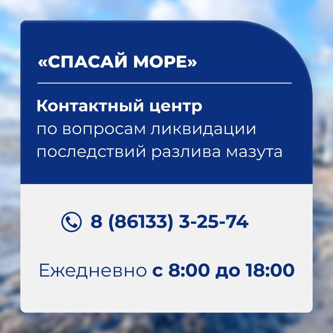 Открыт единый контактный центр по вопросам ликвидации последствий разлива мазута на Черноморском побережье. Обратиться за получением необходимой информации можно по телефону: +7(86133)3-25-74. Контактный центр работает ежедневно с 8:00 до 18:00 по московскому времени.