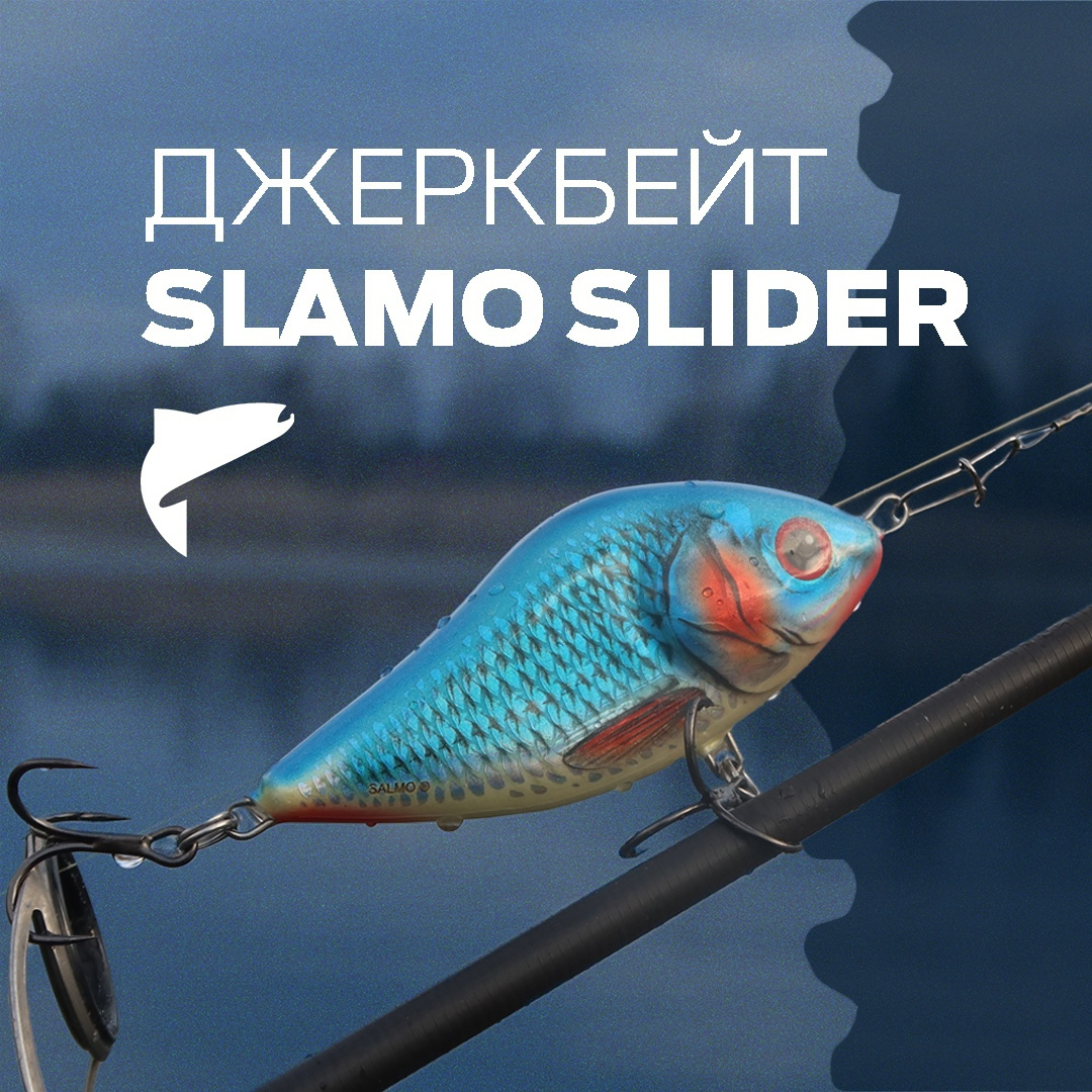 Salmo Slider — легендарный воблер-джеркбейт, доступный в двух версиях: плавающей и тонущей. Эта приманка является глайдером — на проводке она поочерёдно поворачивается в стороны, «глайдит» (от англ. «glide» — «скользить»). Лучше всего свою «фирменную» игру Slider продемонстрирует на проводке непрерывными, частыми и короткими рывками вершинкой удилища. Кроме того, можно использовать и равномерную проводку. Паузы лучше делать с тонущей версией и в холодной воде. На остановках приманка заглубляется или вообще кладётся на дно и ведётся ступенчатой проводкой, как при ловле джигом. На паузах Slider может перехлёстываться, поэтому для ловли нужен жёсткий металлический поводок или толстый флюорокарбоновый. Длину поводка лучше выбирать не менее 25 см. Так как на опускании щука нередко промахивается и может ударить выше приманки, а также нередко глубоко её заглатывает. Самые популярные размеры приманки — 7 и 10 см. Хорошо они себя показали на малых водохранилищах, в заливах и на отмелях крупных