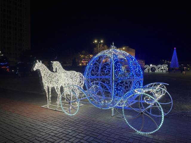 Площадь стала настоящей сказкой благодаря множеству светодиодных арт-объектов. Здесь можно увидеть большие цифры «2025», символизирующие наступающий год. Рядом расположилась милая фигурка зайца. Здесь же - удивительные часы, которые будто отсчитывают время до новогодней