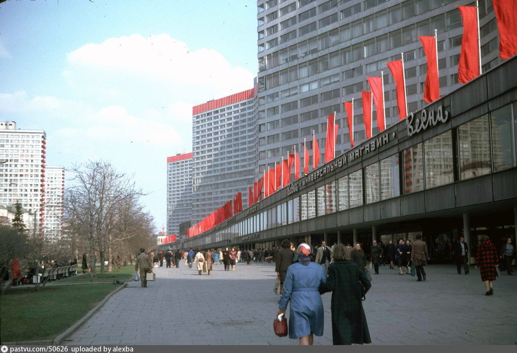 Давайте совершим очередное путешествие сквозь время, прогуляемся по волнам нашей памяти, вспомним, как мы жили тогда и посмотрим, как всё изменилось за прошедшие годы. Поехали! ... Это вид на проспект Калинина уходящий от Садового кольца к Бульварному. Тогда это было популярное место у москвичей и гостей столицы, здесь можно было и прогуляться, и пройтись по разным магазинам, например, зайти в универсам "Весна", там периодически выкидывались что-будь дефицитное. Фото 1982 года, Адриан Брейн В начале девяностых проспект переименовали в улицу Новый Арбат. Вместо скамеек на аллее слева теперь платный паркинг, а универсам "Весна" реконструировали, теперь это модный ТЦ Любили в те годы обильно к праздникам украшать город красными полотнами, лозунгами и портретами. Это здание Киевского вокзала. Фото 1983-1984 года В наши дни город к праздникам украшают, но, обычно, без идеологической подоплеки. Сам вокзал в новейшей истории отреставрировали, гербы СССР над входами заменили на Георгия Победон