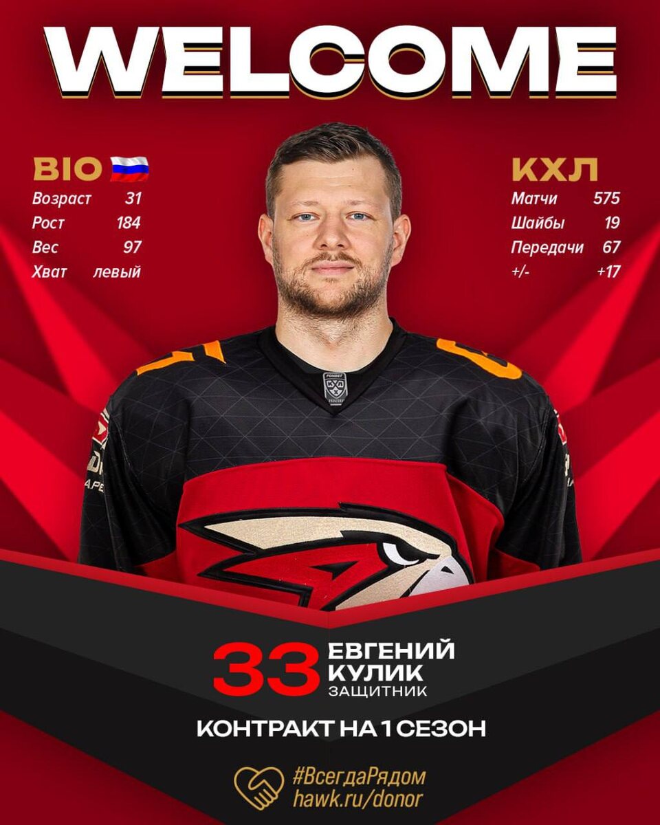 Контракт с игроком продлится до конца сезона 2024/25. В своей карьере в Континентальной хоккейной лиге (КХЛ) Кулик провел 575 матчей, набрав 86 (19+67) очков и имея показатель полезности «+17». Евгений Кулик будет выступать под номером 33. "Вариативность и глубина состава имеют большое значение для любой линии, включая защиту. Кулик – надежный защитник, который активно играет в меньшинстве и обеспечивает защиту наших ворот. Это игрок с развитым духом и характером, готовый поддержать своих партнеров", - отметил Герман Чистяков, генеральный директор ХК «Авангард». Ф️ото: ХК Авангард