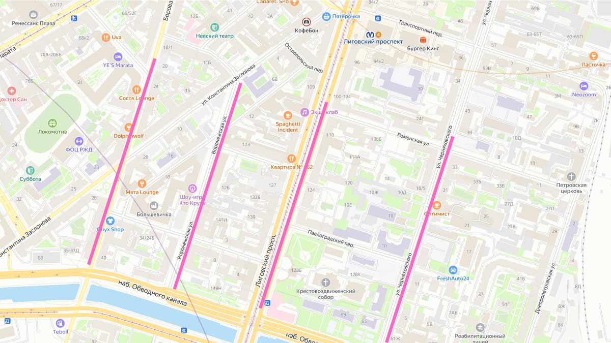 В прежние времена названия улиц определялись либо родом занятий жителей, либо природными особенностями местности, либо наличием поблизости значимого, всем известного объекта. Потом всё запуталось. Вот например, улицы: Боровая, Воронежская, Лиговский, Черняховского. Названия этих параллельных, практически соседних, улиц никак не связаны между собой по смыслу, каждое название имеет свою интересную историю. 1. Улица Черняховского получила своё имя в 1952 году в память советского генерала, дважды Героя Советского Союза Ивана Черняховского. А до этого называлась Предтеченской - по церкви Св.Иоанна Предтечи, находящейся поблизости, а ещё раньше Моховой - по причине низкой, болотистой местности. 2. Лиговский проспект - наследник канала, берущего начало из речки Лиги. 3. Воронежская улица до 1858 года была Средней, по среднему своему положению между Лиговским каналом и Боровой улицей. 4. Боровая улица очевидно пролегла на месте бывшего бора, и сменила Песчаную дорогу. В первой половине XIX ве