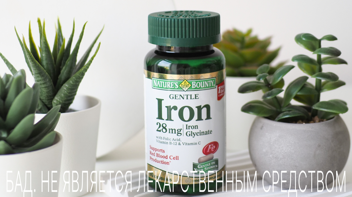 Найти его можно в комплексе Легкодоступное железо 28 мг Nature’s Bounty (Нэйчес Баунти), да еще и в комбинации с витаминами группы В и С. Они повышают усвоение железа и полезны для здоровья волос (стимулируют выработку коллагена, который укрепляет их структуру).