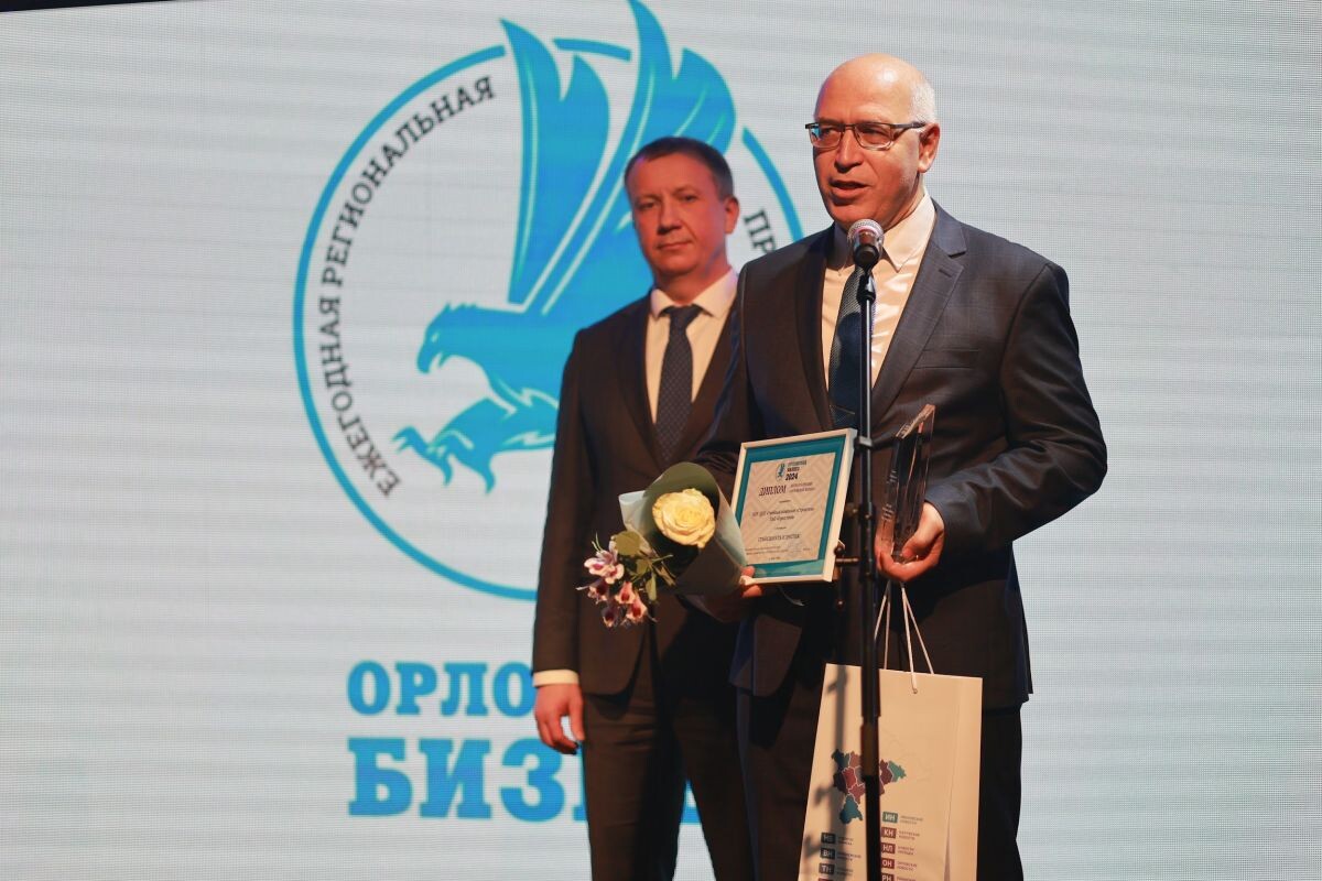 Хрустальную статуэтку директору учебного комбината Виталию Петрище вручил руководитель департамента промышленности и торговли Орловской области Денис Леонов.