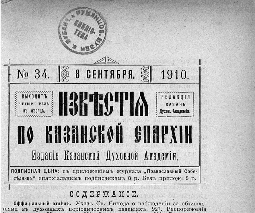 Храм Владимирской иконы Божией Матери. 1910 год. 8 сентября. Известия по Казанской Епархии № 34. Издание Казанской Духовной Академии. Священник Порфирий Руфимский. (Кой что из моего дневника). Часть 2. Направляю свой путь в то село, где провел первые годы своего священства. Еду по реке Волге. Флотилия пароходная удивляет теперь всех своей численностью, красотой и изяществом, гигантскими размерами и, что особенно важно, дешевизной передвижения. Не то, что в былое время, когда мы, ученики духовного училища, спускались по Волге на «парусных косоушках». Но за то красавица Волга с той поры стала совершенно неузнаваема. Оголилась она в своих берегах, обмелела в своем русле и несет теперь мутные осадки нефтяных остатков от своего истока до самого Каспия. Над мутной водой и мутные думы: когда было много воды, совсем не было парового флота; появился флот, не стало воды ... Оставляю за собой столицу чувашскую, добираюсь до горных черемис. Еду, значит, в район инородческих поселений. На минуту ос