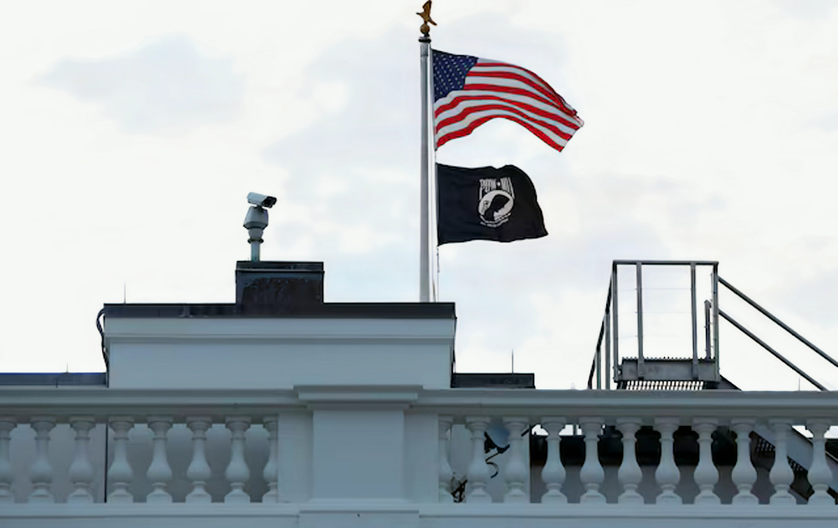 Флаг POW-MIA, посвященный военнопленным и военнослужащим, пропавшим без вести, был перемещен бывшим президентом Дональдом Трампом в 2020 году с видной должности на вершине Белого дома на место на Южной лужайке.