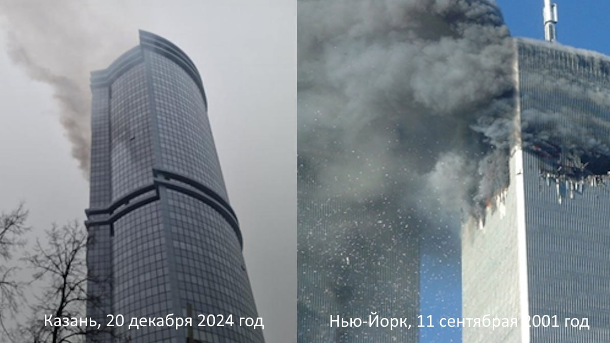 Атака очень похожа на теракт в Нью-Йорке 11 сентября 2001 года. Возможно, кто-то скажет, что как можно сравнивать 11 сентября 2001 с тысячами убитых людей и 21 декабря 2024 года, ж/к «Лазурные небеса», где нет обрушения и никто не пострадал. Визуально это так, но давайте обратим внимание на абсолютные сходства этих двух событий.