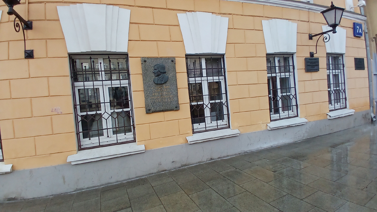 В Москве есть дом, в котором Н.В.Гоголь провел 4 последних года жизни. Находится он прямо рядом с м.Арбатская, через дорогу. Мы тут были с младшим сыном еще в июле, а рассказываю вот только сейчас. Маленький домик с мемориальной табличкой: в этом доме с 1848 по 1852 годы жил и умер Николай Васильевич Гоголь Сам дом был построен до пожара 1812 года, перестраивался несколько раз и менял хозяев. В 1847 году здесь поселился граф Алексей Петрович Толстой, который сначала снимал комнаты верхнего этажа. А потом его жена выкупила дом целиком. И вот как раз к ним и переехал Гоголь в декабре 1848 года. После революции дом был отдан под коммуналки, здесь проживала 31 семья. Но в конце 1960-х годов здание передали библиотеке. И тогда здесь открыли сначала пару мемориальных комнат, а затем уже и музей. Музей совершенно не большой по размеру, всего несколько комнат В прихожей висит плащ, цилиндр, будто бы писатель только что вернулся с прогулки тут же сундук, переделанный в витрину для экспонато