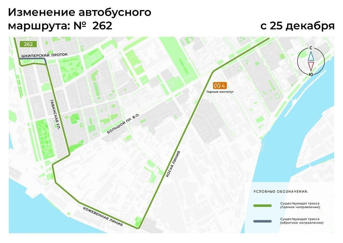 C 25 декабря 2024 года изменится трасса следования автобусного маршрута №262 в Петербурге. Об этом сообщили в пресс-службе компании ГКУ «Организатор перевозок». Автобусный маршрут направлен: – в прямом направлении: по действующей трассе до Косой линии, далее по Большому проспекту В.О., далее по действующей трассе; – в обратном направлении: по действующей трассе до 8-9-й линий В.О., далее по Большому проспекту В.О., Косой линии, Кожевенной линии, далее по действующей трассе. Также изменяется месторасположение остановок в районе станции метро «Горный институт» и вводятся новые. Специалисты просят учитывать данную информацию при планировании маршрута. Ранее сообщалось, что в Петербурге на маршруты вышли экипажи Дедов Морозов и Снегурочек.