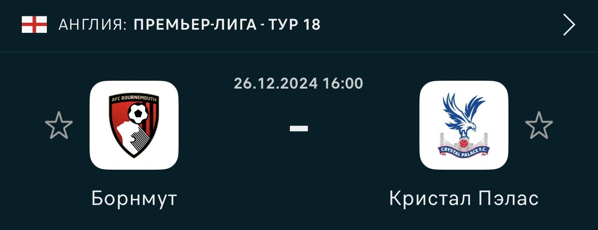 26 декабря 2024 года состоится матч 18-го тура Английской Премьер-лиги между "Борнмутом" и "Кристал Пэлас". Давайте проведем детальный анализ. Борнмут - Занимает 8-е место в турнирной таблице с 25 очками - Демонстрирует отличную форму, не проигрывая в последних 5 матчах - В среднем забивает 2.2 гола за матч в последних играх - На домашнем стадионе показывает уверенную игру с минимумом поражений Кристал Пэлас - Находится на 15-м месте с 16 очками - В последних матчах демонстрирует нестабильные результаты - Недавно потерпел крупное поражение от Арсенала со счетом 1:5 - В гостях команда играет достаточно результативно - В последних 15 матчах: 6 побед Кристал Пэлас, 4 победы Борнмута, 5 ничьих - Последняя встреча завершилась победой Борнмута со счетом 1:0 1. Борнмут находится в отличной форме и играет дома 2. В последних матчах обе команды показывают результативный футбол 3. Статистика личных встреч говорит о том, что матчи между этими командами часто получаются результативными - Пл