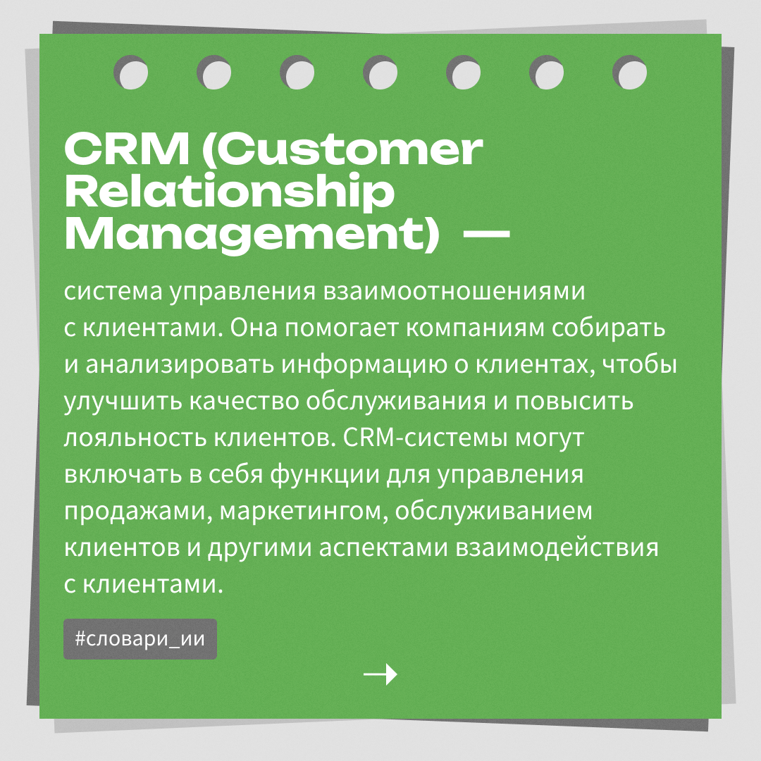 CRM (Customer Relationship Management) — система управления взаимоотношениями с клиентами. Она помогает компаниям собирать и анализировать информацию о клиентах, чтобы улучшить качество обслуживания и повысить лояльность клиентов. CRM-системы могут включать в себя функции для управления продажами, маркетингом, обслуживанием клиентов и другими аспектами взаимодействия с клиентами.