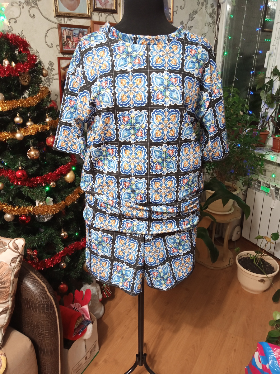 Сшила я себе вот такой костюм на лето. Название ткани не знаю. Вроде кусочек ткани был большой и я надеялась на штаны. Но получились шорты. Ну ладно. Шорты так шорты. Футболка от Viki sews, Гелла, xl на рост 162-168. Шорты по выкройке штанов из бурды.