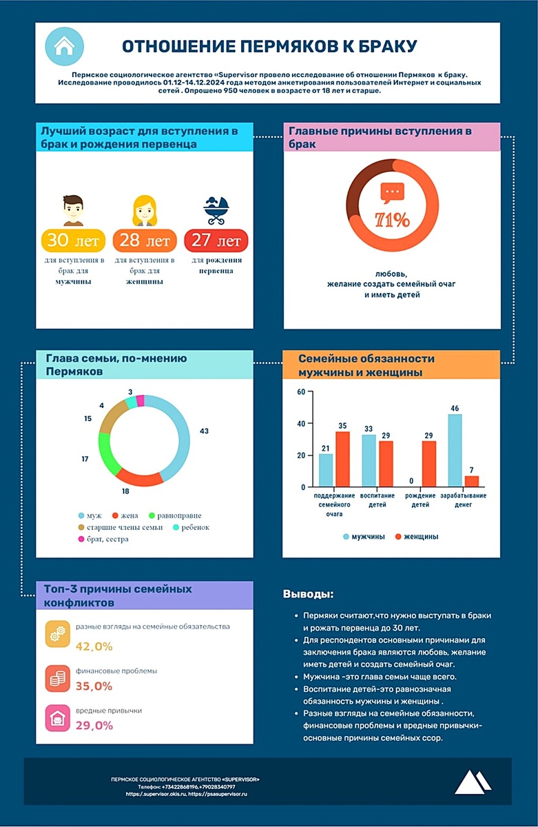 Пермское социологическое агентство «Supervisor» закончило исследовательский проект: «Отношение Пермяков к браку». В рамках исследования были выявлены основные установки жителей Пермского края относительно семейных ценностей и взглядов на брак. В опросе приняли участие 950 человек различных возрастных групп. 1. Возраст вступления в брак и рождения первого ребенка. Большинство участников опроса (78,0%) считает, что вступление в брак и рождение первого ребенка должно происходить до достижения возраста 30 лет. Это мнение особенно распространено среди представителей старшего поколения, однако молодые люди также склонны придерживаться данной позиции. 2. Причины для создания семьи. Основными мотивами для заключения брака респонденты назвали любовь (68,63%), стремление завести детей и создание семейного очага (72,94%). Эти данные свидетельствуют о сохранении традиционных ценностей в современном обществе. 3. Роль мужчины в семье. Почти половина опрошенных (43,0%) отметили, что муж является глав