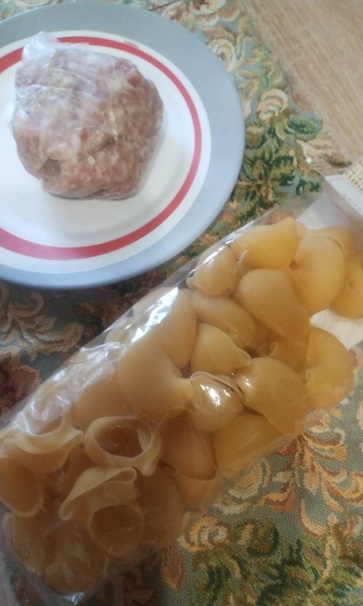 Не спится.... Ну никак... Ну все равно повалялся, понежился в тёплой постельке, значит отдохнул. Вот что я придумал приготовить. У меня в морозилке отыскался кусочек фарша. Но такой маленький, всего на пару котлет. Наверное суп с фрикадельками делал и остаток заморозил. Ни туда, ни сюда, слишком мало. Две котлеты делать скучно. Думал макароны по флотски приготовить. И тут пришла в голову идея. Старшая сестрёнка мне как-то на ВБ заказывала набор продуктов. Среди них были вот такие макаронные изделия. Большущие ракушки из твердых сортов пшеницы. Сразу по размерам понятно, что в них можно положить начинку. Решил именно так и сделать. Отварил эти ракушки в солёной воде до состояния полуготовности. Я же ещё тушить их потом буду, и они дойдут до готовности . В фарш добавил соль, лук чеснок и душистый перец. Положил начинку из фарша в каждую ракушку. Понемножку клал, а то фарша мало, чтобы на все хватило. Затем залил эту красоту смесью из половины стакана тёплой кипяч