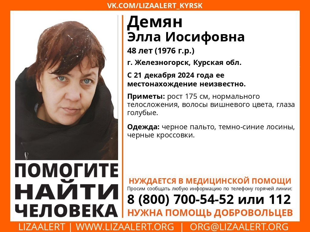 В Курской области поисково-спасательный отряд «Лиза Алерт» разыскивает 48-летнюю жительницу Железногорска Эллу Иосифовну Демян. С 21 декабря этого года ее местонахождение неизвестно.