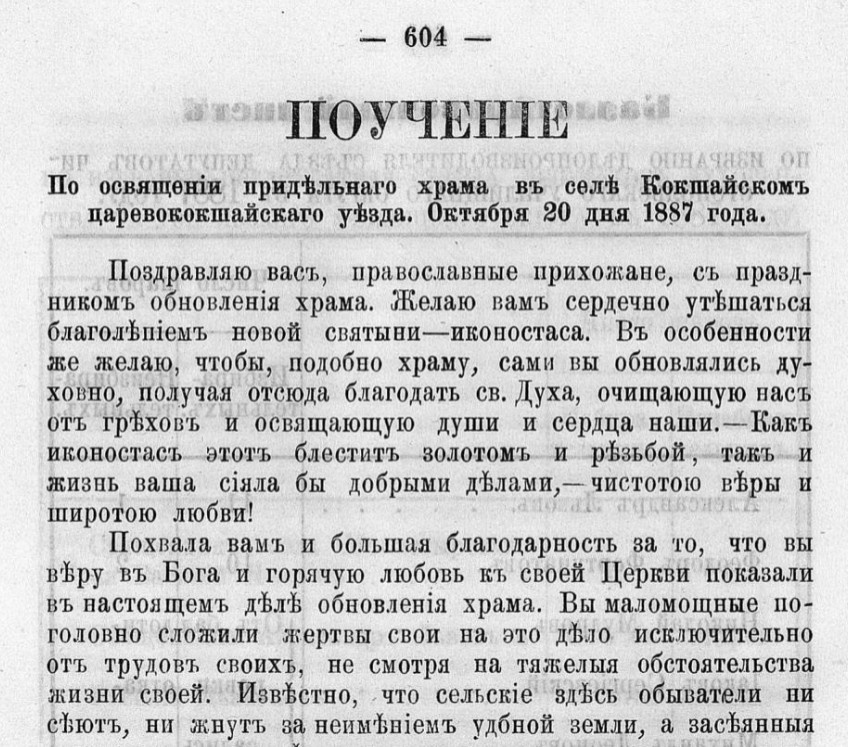 Похвала вам и большая благодарность за то, что вы веру в Бога и горячую любовь к своей Церкви показали в настоящем деле обновления храма. Вы маломощные поголовно сложили жертвы свои на это дело исключительно от трудов своих, не смотря на тяжелые обстоятельства жизни своей. Известно, что сельские здесь обыватели ни сеют, ни жнут за неимением удобной земли, а засеянные и готовые к жатве поля деревенских прихожан пострадали ныне от градобития. При таких несчастиях сделанная вами жертва на обновление храма весьма великою и цепною должна быть в глазах Божиих, тем более, что и заработки, которыми пропитываете себя, вообще ныне скудны. И вот при всей скудости своей оказались вы столь щедрыми! О, спаси вас, Господи, от бед и напастей! О, Господи, услыши молитву нашу и вопль бедных людей, даруй им все потребное для души и тела! Приклони, Господи, ухо Твое и услыши ны! Так, возлюбленные, непрестанно молитесь Господу и не уреживайте посещать храм святый сей; потому что молиться в храме в присутствии Бога весьма нужно нам для более успешного получения милости от Бога и спасения души.