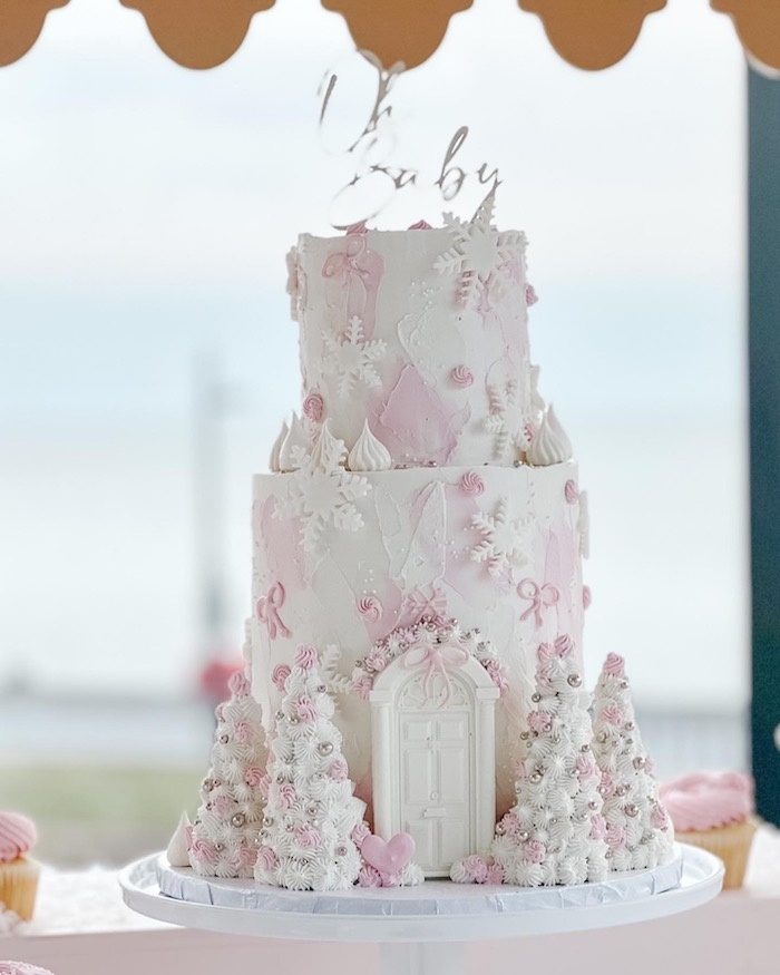 Уютная розовая тележка предлагала гостям сказочные десерты: капкейки, макаронс, печенье в виде снежинок и невероятный торт!