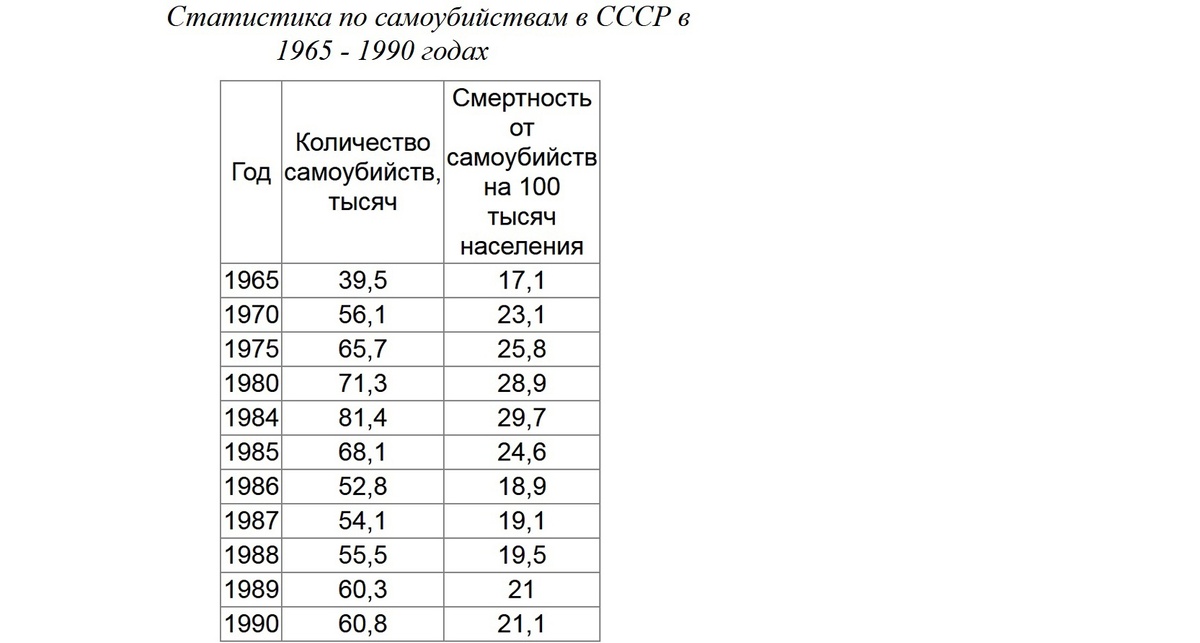 Согласно оценкам исследователей, количество самоубийств более 20-ти случаев в год на 100 тысяч человек - это красная черта, переступив которую, общество нуждается в лечении (в Союзе эту черту переступили к 1970 году). Если верить архивам, то СССР занимал пятое место в мире по числу завершённых самоубийств. При этом нужно понимать, что число незавершённых попыток наложить на себя руки - ещё больше. А число людей, которые не решаются на суицид, но имеют большие проблемы психологического характера - ещё больше. Известно, что проблемы в семье, алкоголизм, наркомания и суициды тесно связаны друг с другом. Поэтому статистика самоубийств - это очень важный параметр при оценке психического здоровья общества.