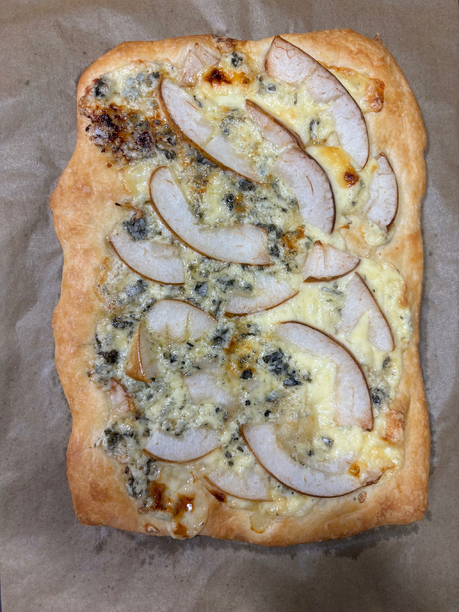 Слоеное дрожжевое тесто китайская груша сыр с плесенью мед подсолнечное масло Тесто выкладываем на противень и раскатываем. Сыр мелко нарезаем, выкладываем на тесто. Грушу режем тонкими дольками , выкладываем сверху на сыр, слегка поливаем мёдом. Края смазываем маслом. Разогреваем духовку до 180° градусов и ставим пиццу на 10-15 минут до образования золотистой корочки. Готово!