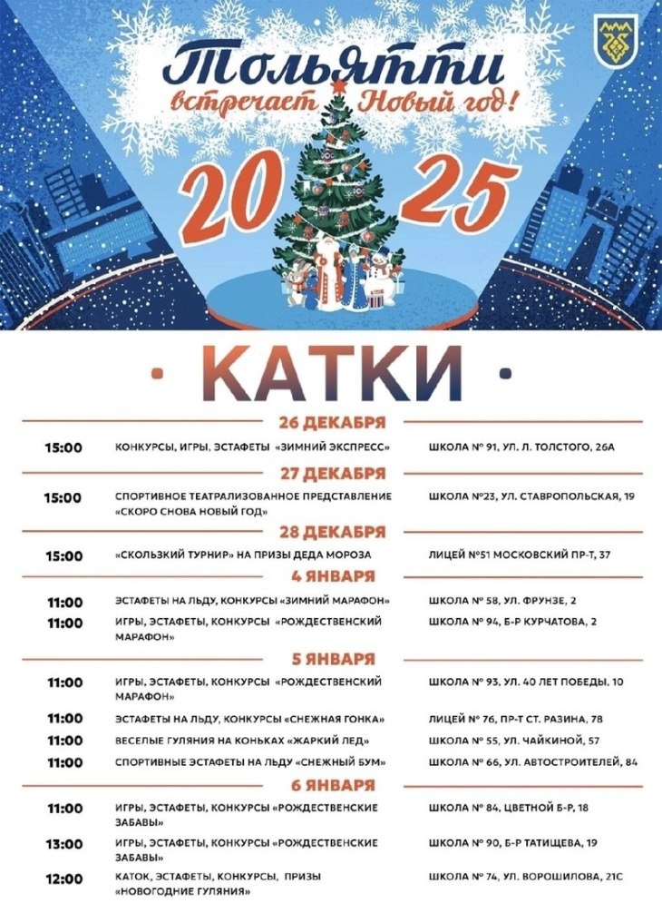 В Тольятти пройдут ледовые праздники под открытым небом, сообщает администрация города. Праздничные программы пройдут во всех трех районах города. Мероприятия будут организованы на катках, расположенных на территориях школ, и включат спортивные соревнования на льду, новогодние гуляния с катаниями на коньках и конкурсы. Ближайшие праздники запланированы: • 26 декабря, 15.00 – школа № 91 (ул. Льва Толстого, 26а); • 27 декабря, 15.00 – школа № 23 (ул. Ставропольская, 19) с театрализованным представлением; • 28 декабря, 15.00 – лицей № 51 (Московский проспект, 37).