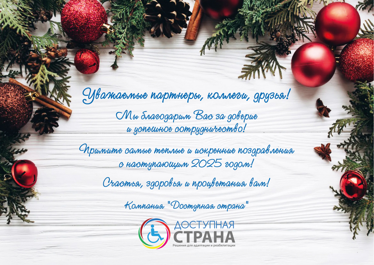 Коллектив компании «Доступная страна» с теплом и благодарностью поздравляет вас – наших клиентов и деловых партнеров – с наступающим Новым 2025 годом и Рождеством! Мы благодарны вам за доверие и сотрудничество! Пусть Новый год принесет в вашу жизнь радость, успех и новые возможности. Спасибо вам за то, что были с нами в этом году. Желаем вам здоровья, благополучия и исполнения всех желаний! В связи с наступающими праздниками мы принимаем заказы с отгрузкой до 28 декабря. С 9 января 2025 г. работаем в обычном режиме. В наличии самые востребованные решения для обустройства доступной среды и санузлов для инвалидов, а также детское развивающее оборудование для оснащения учреждений образования и реабилитационное оборудование для медучреждений и ЦСОН. Посмотреть оборудование можно по ссылке В 2024 году компания «Доступная страна» получила высокие оценки от профессионального сообщества. Наши решения для обеспечения доступности были отмечены отраслевыми экспертами: В течение года мы участвовал