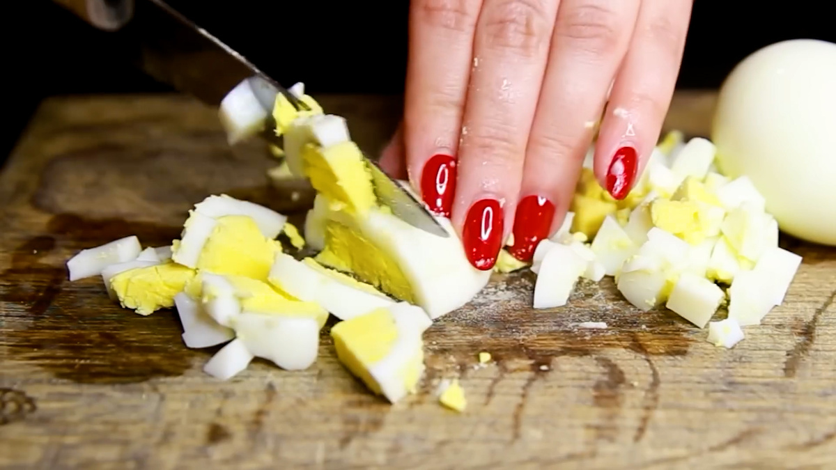 Нарезаем 2 вареных яйца на небольшие кубики.
