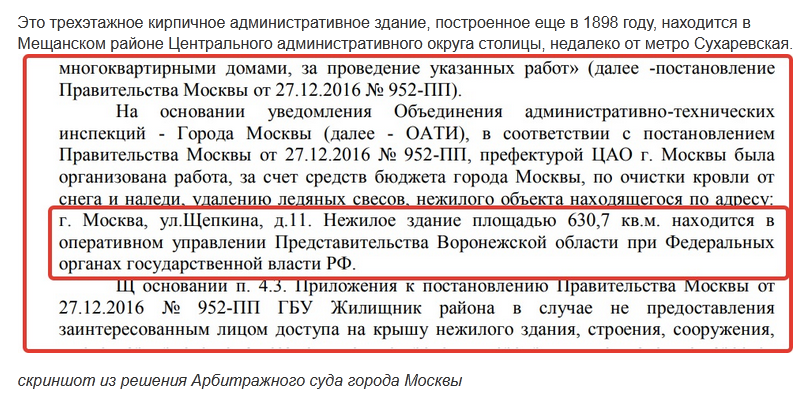 Он отказался тогда оплачивать работы ГБУ «Жилищник» префектуры ЦАО г. Москвы по уборке снега с крыши здания на Шепкина, 11 и решением Арбитражного суда г. Москвы с воронежского представительства был взыскан штраф в сумме 9 тысяч 862 рубля 20 копеек. И именно благодаря этой истории с копеечным штрафом, который сразу не захотел платить вице-премьер Алексей Аксенов, «Блокноту» стала известна история с появлением у воронежского представительства здания в Москве по ул. Щепкина, 11.