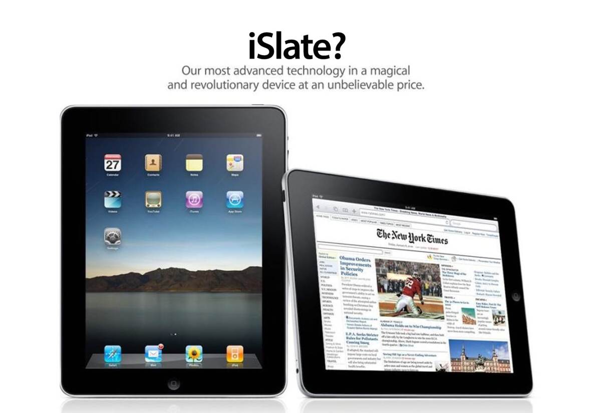 24 декабря 2009 года: по мере того, как слухи о возможном появлении планшета Apple достигают апогея, в Интернете распространяется новость, что новое устройство будет называться iSlate. Новость появилась в связи с тем, что Apple, не афишируя сделки, приобрела доменное имя iSlate.com несколько лет назад. То же самое она сделала в конце 1990-х для iPhone, задолго до дебютного выхода устройства. Издание TechCrunch обнаружило, что имя iSlate было зарегистрировано в качестве товарного знака неизвестной компанией из штата Делавэр под названием Slate Computing LLC еще в ноябре 2006 года. Похоже, что это была подставная компания, поскольку документы подписывала Регина Портер, старший специалист Apple по товарным знакам. Молчание о названии будущих продуктов было всегда типичным для Apple. Компания часто делала все возможное, чтобы избежать на ранних этапах известий о выпуске своих продуктов, при этом заранее заботясь об обеспечении владением необходимыми торговыми марками. Проверка принадлежнос