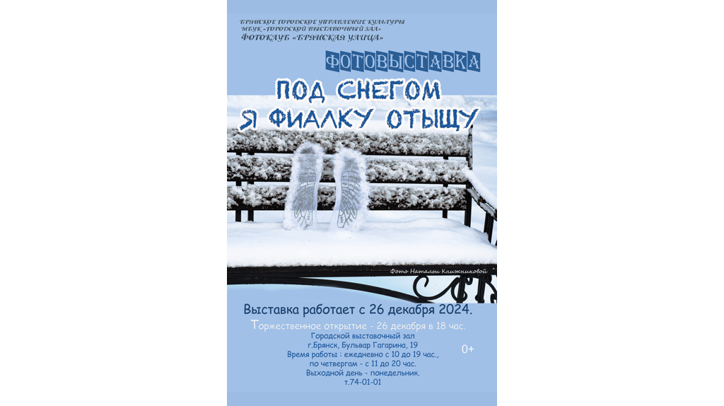 В Брянске 26 декабря откроется фотовыставка «Под снегом я фиалку отыщу» фотоклуба «Брянская улица». Экспозиция будет представлена в Городском выставочном зале на бульваре Гагарина. Фотовыставка названа строкой из стихотворения Геннадия Шпаликова. Посетители увидеят не только традиционные новогодние сюжеты, но и самые значимые для фотографов «Брянской улицы» снимки, сделанные в уходящем году. Любимые авторами интересные, необычные фото будто открывают фантастическое окно в мир снежных фиалок. Всего на выставке представлено 64 снимка 18 фотографов. Открытие выставки состоится в 18:00. Она будет работать до 26 января. Возрастное ограничение 0+ В Брянске 26 декабря откроется фотовыставка «Под снегом я фиалку отыщу»