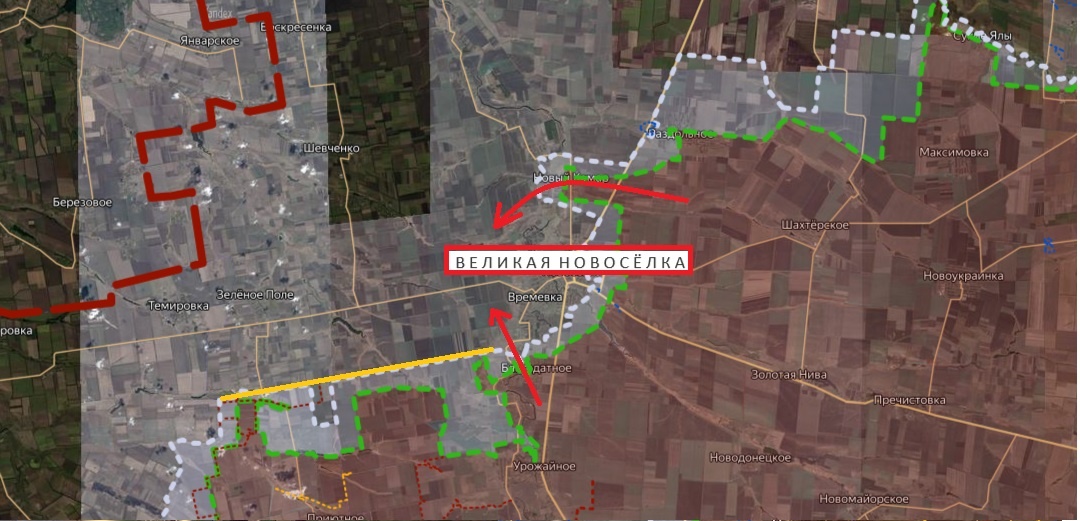 Наши продолжают формировать самый эффективный инструмент по освобождению города – клещи, а по-простому – охват. Наиболее вероятное место, где в ближайшее время мы увидим создание клещей, тут: Это вид из, скажем так, люка самолёта. Тут ясно видно, как наши эти клещи формируют. И с севера, и с юга наши стабильно продвигаются. На юге наши ещё выравнивают линию (жёлтым). Можно предположить, что в какой-то момент вся эта грамотно выстроенная линия продвинется в мгновенье сначала до самой трассы, а там уже… Но это лишь предположение. Сейчас взглянем на основные события, которые тут произошли. Сначала взглянем на формирование северной ветки клещей: Н.Комар окончательно перешёл к нам. Напомним, что пару недель назад наши предприняли в его направлении рывок, казалось, что уже и закрепились там, но не получилось. С той стороны пришла подмога и наши отошли. Зато прощупали что и к чему. И вторая попытка увенчалась успехом. Сейчас наши там укрепились, тем самым перекрыв обе северных дороги, по кото
