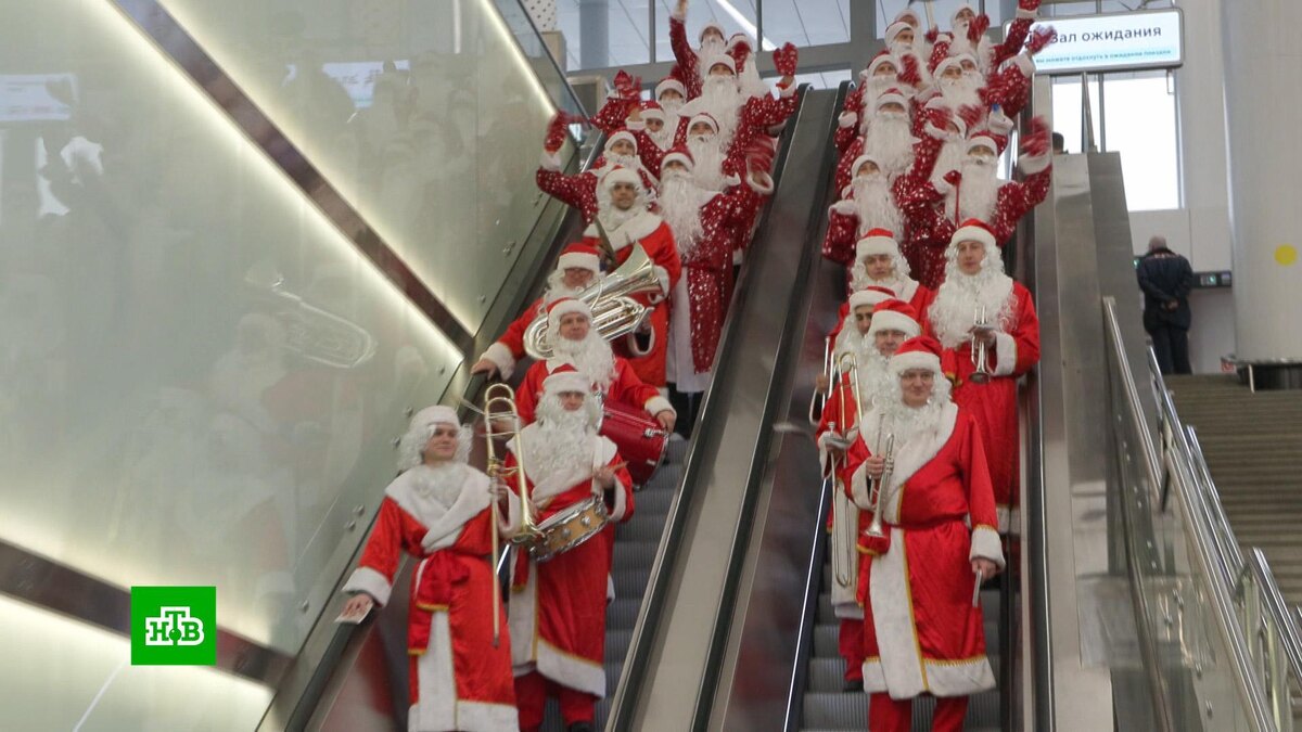 [ Смотреть видео на сайте НТВ ] Танцевальный флешмоб 100 Дедов Морозов проходит весь день на станциях московского транспорта. Поздравления с Новым годом получили пассажиры столичной подземки. С праздниками их поздравили сразу 100 новогодних волшебников. Все началось на станции «Нижегородская», где внезапно появился музыкальный десант Дедов Морозов. Они играли на музыкальных инструментах, пели и танцевали. Пассажиры уверяют, что подобные активности поднимают им настроение. Не обошлось без сладких подарков и фотосессий. Затем команда Дедов Морозов отправилась на другие станции. Весь день они будут создавать настроение пассажирам метро, МЦК и МЦД-3. [ Смотреть видео на сайте НТВ ]