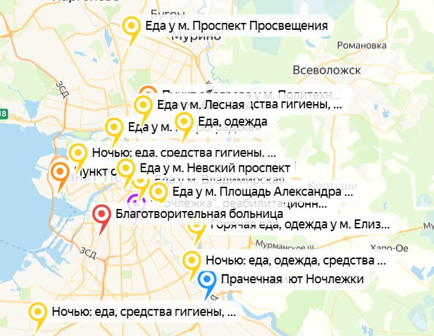 В Петербурге появилась онлайн-карта с обозначением мест, где бездомные люди могут получить помощь. Ее создала методолог курсов и искусствовед Елизавета Носкова на основе информации «Ночлежки». Лиза решила сделать инструмент, который подскажет, куда можно направить бездомного, встреченного на улице. «Я сталкивалась с людьми, которые волонтерили для „Ночлежки“, вокруг меня всегда были те, кто ее поддерживает своим присутствием, руками. Пока [для себя] я нашла такую цифровую форму волонтерства и попробовала ее развернуть», — рассказывает Лиза. Места на карте Лиза разделила на три условных категории и обозначила цветовыми тегами: где можно постирать, помыться, переночевать и получить еду, одежду и медицинскую помощь. Сложности возникли с муниципальными пунктами помощи, в которых просят документы. С этими и другими местами Лизе обещали помочь ребята из «Ночлежки», а также свои дополнения можно написать на почту, указанную в карте. Лиза уже ощутила пользу своей инициативы. На следующий день