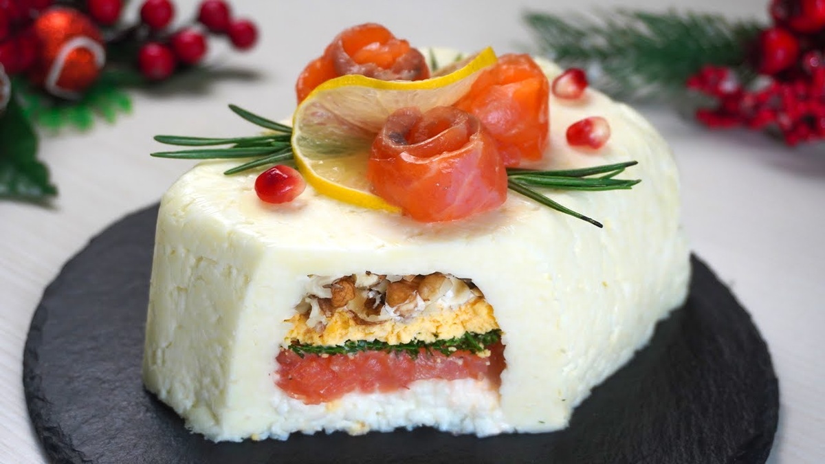 Всем привет! С вами снова Катя Паприка, и сегодня мы с вами приготовим такой очень красивый, необычный, а самое главное вкусный новогодний салатик, который стопроцентно привлечет внимание всех ваших гостей на праздничном столе. Не забывайте подписываться на этот канал, если вы еще этого не сделали. Нам понадобится: Нам понадобится желатин. Для этого разведите его по инструкции на упаковке в теплой воде. Нужно натереть сыр на мелкой терке. Это будет наша оболочка для салата. Выкладываем сыр в миску и добавляем подготовленный желатин, греческий йогурт и перемешиваем до однородного состояния. Для этого салата можно взять стандартную форму для кексов. В описании напишу граммовки для полной формы, а я сделаю половину от этого объема, сделав перегородку из фольги. Внутрь для удобства выкладываем пленку, потом будет удобно вынимать. Выкладываем подготовленный сыр с желатином в форму, формируя дно и бока. Хорошо прижимайте ложкой, чтобы сделать плотный и ровный слой. Можно пока убрать загото