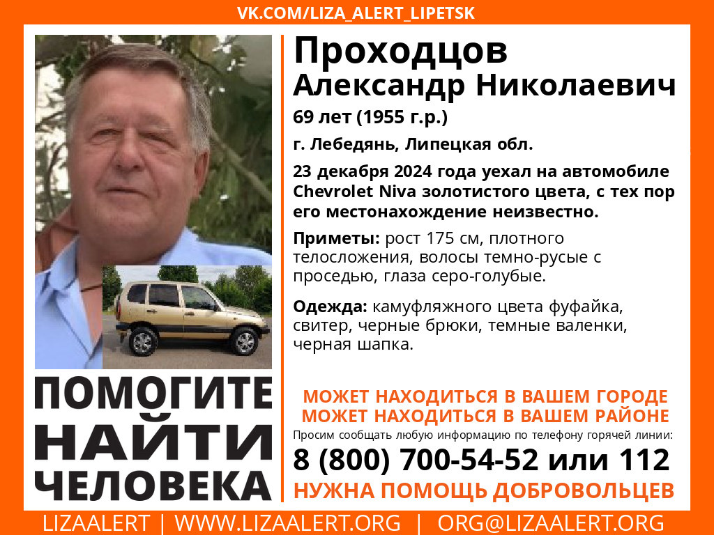 В Липецкой области начались поиски пропавшего 69-летнего Александра Николаевича Проходцова. В минувший понедельник, 23 декабря, пенсионер из Лебедяни сел за руль своего внедорожника «Нива Шевроле» золотистого цвета и уехал. С тех пор о местонахождении мужчины ничего не известно. Об этом сообщили в региональном отделении поисково-спасательного отряда «Лиза Алерт».
