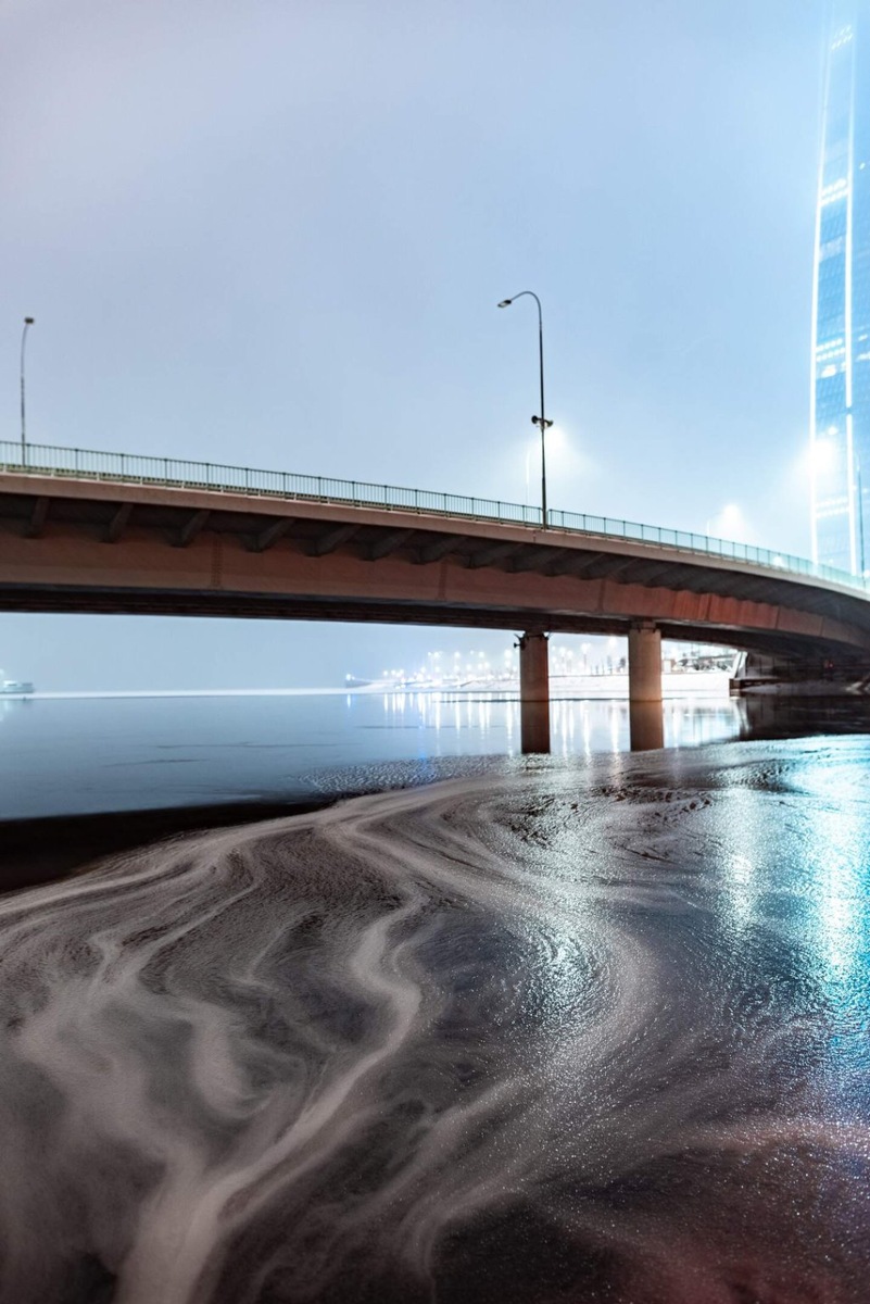 Из-за чередования обильных снегопадов с плюсовой температурой на городских водоемах периодически можно встретить начальные формы оледенения. Удалось увидеть шугу, ледяное сало и снежуру. Появление снежуры — предвестник ледостава, процесса образования постоянного ледового покрова на реках и озерах. Снег попадает в охлажденную воду, но уже не тает, и получается эластичная снежная масса, из которой течение создает причудливые узоры. При морозе в отсутствие ветра масса замерзает и становится уже основой зимнего льда.