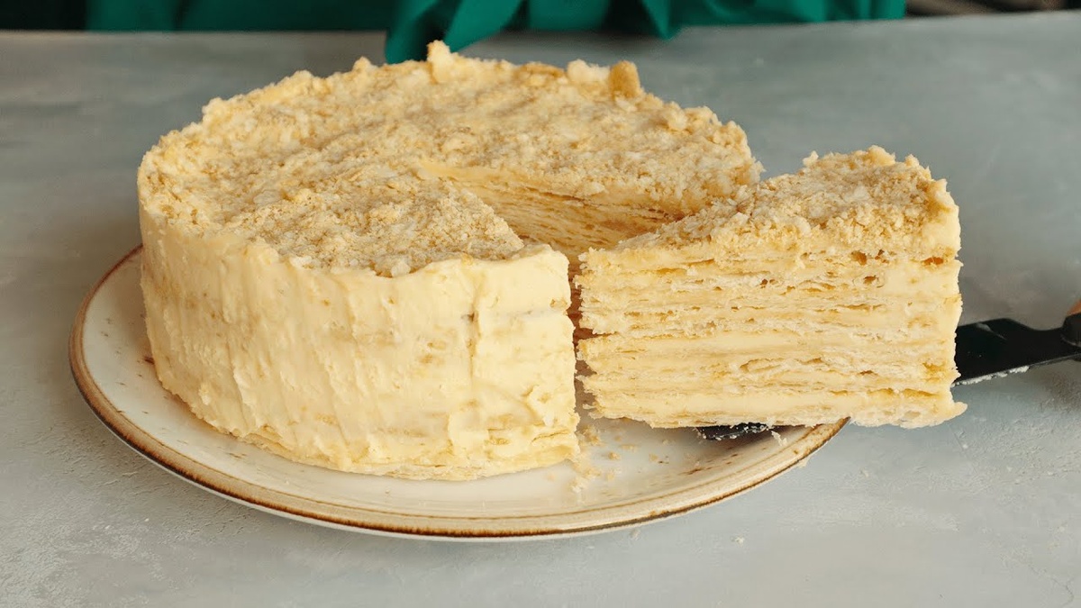 Всем привет, друзья! Сегодня готовим самый любимый мой торт, Наполеон. Первым делом начнём замес коржей. Для этого смешиваем яичный желток, сметану. Муку смешиваем с солью. Берем сливочное масло из морозилки, окунаем его в муку и натираем на терке. Я натираю на самой мелкой, можно смешать при помощи блендера с ножами. Главное делать это быстро, чтобы сливочное масло не успело растаять. В итоге получилась вот такая крошка. И теперь соединяем жидкую часть и сухую и быстренько замешиваем тесто. В этом тесте главное быстро смешать все ингредиенты, чтобы масло не успело растаять. Иначе вместо воздушного хрустящего теста получатся твердые очень плотные коржи. Теперь делим тесто на шарики. Я сейчас поделила на 7 по 60 граммов. Убираю тесто в холодильник минимум на 3-4 часа, можно на ночь. Не забудьте накрыть пищевой пленкой или пакетиком, чтобы тесто не заветрилось. Готовим крем. Первым делом замочим желатин. Засыпаю желатин в холодную воду и оставляю до набухания. У меня ушло минут 15 на