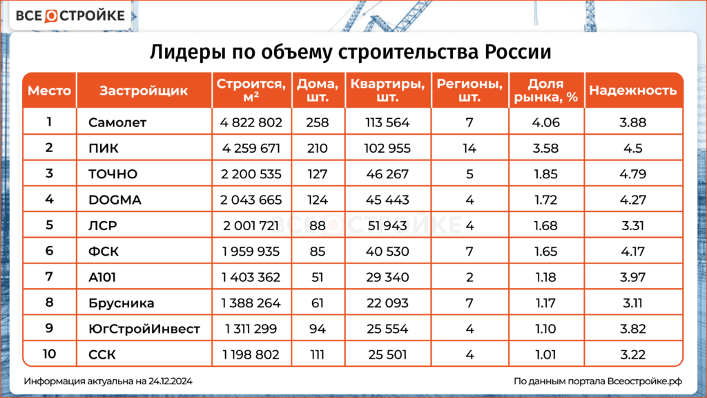 Таким образом, к концу 2024 года рейтинг крупнейших девелоперов страны по объему текущего строительства выглядит следующим образом:
