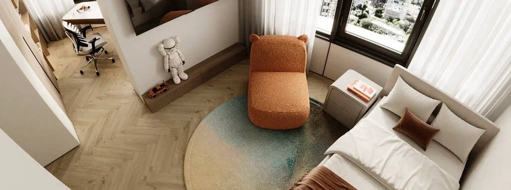 • Для детей старшего возраста (3–7 лет) необходимо предусмотреть пространство для самостоятельных игр и обучения. Пространство в комнате должно быть гибким, чтобы в будущем можно было трансформировать его под потребности растущего ребёнка. Например, небольшой столик для творчества можно впоследствии заменить на полноценное рабочее место. Кроватка и шкаф для одежды также должны быть адаптируемыми – с возможностью модификации по мере того, как ребёнок становится старше.