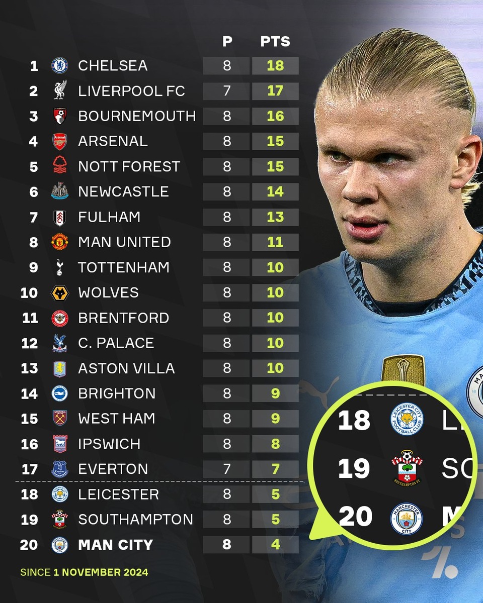 После 17-ти туров Премьер-лиги в турнирной таблице лидирует «Ливерпуль», набравший 39 очков, при этом у подопечный Слота есть матч в запасе – перенесенное из-за непогоды мерсисайдское дерби. На четыре балла от «красных» отстает «Челси», третью строчку занимает «Арсенал», который набрал 33 очка. На четвертом месте расположился «Ноттингем Форрест», заработавший 31 балл. «Ман Сити» проиграл в девяти из последних 12-ти матчей, кризисные «горожане» занимают седьмую позицию в турнирной таблице АПЛ. Соседи из «красной» части Манчестера в последнем туре уступили «Борнмуту» и остались на 13-й строчке. В копилке «Тоттенхэма» 23 очка, позволяющие «шпорам» занять 11-е место. Если бы Премьер-лига стартовала 1 ноября, расположение команд в турнирной таблице было бы совсем другим. За восемь матчей, прошедших с 1 ноября, лидером турнира стал бы «Челси». Но «Ливерпуль» от первого места отстает всего на одно очко, имея игру в запасе. В топ-4 вошли бы «Борнмут» и «Арсенал», а «Ноттингем Форест» опустился