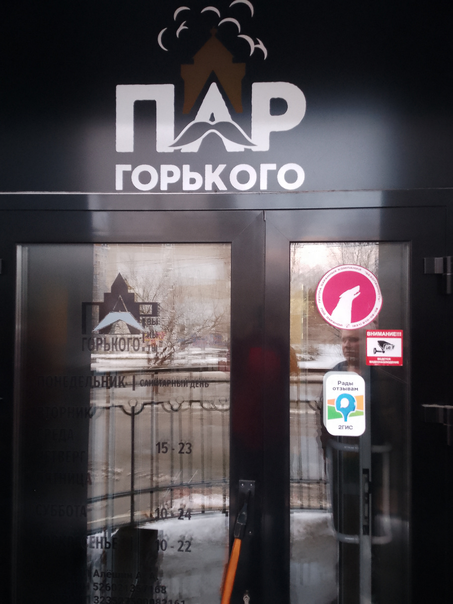 Этой осенью произошло повторное открытие общественной бани Пар Горького в Московском районе города. В канун Нового года посетил её и хочу рассказать о ней вам. Баня как бы подразумевает мужской разряд, но в ней так же бывают и семейные дни. Раздевалка, здесь у каждого гостя свой ящик, открывается и закрывается браслетом который дают на входе. После раздевалки попадаем в комнату отдыха, здесь стоят столы и диванчики за которыми люди отдыхают. На одной из стен висит большой телевизор, в моё посещение вел трансляцию Матч ТВ. Рядом с ним находятся полки с различными книгами, можно почитать понравившуюся. Есть довольно интересные нарды, для проведения досуга. Одна из стен украшена поленницей дров. На другой наш земляк Максим Горький на паровозе с веником. В этой бане в начале каждого часа коллективный пар. Происходит это так, люди сидят за столами общаются, кто то пьет пиво, кто то чай, звенит звонок и народ начинает собираться в парильном отделении. Всем этим процессом управл